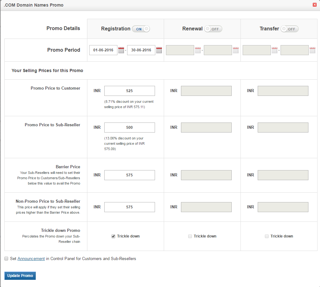 - Set Announcement under Control Panel for Customers and Sub-Resellers: Selecting this checkbox would add an Announcement in your Customers and Sub-Resellers Control Panel with details about this promotion.