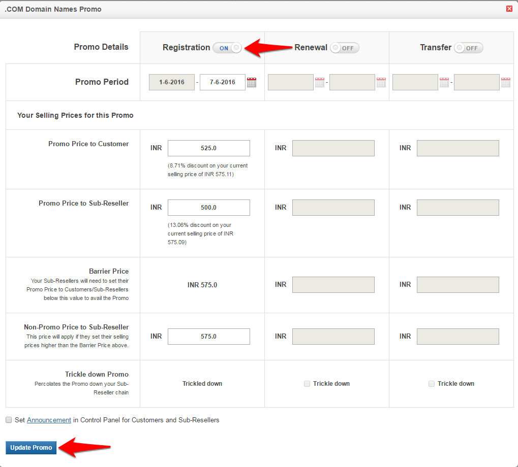 You may modify the Promo Price to Customer, Promo Price to Sub-Reseller and Non-Promo Price to Sub-Reseller at any time.