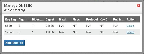 The Manage DNSSEC view will display a list of DS Records, if already added. Here, click the Add Records button to proceed.