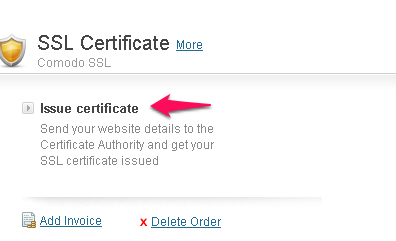 In the Order Information view, navigate to the SSL Certificate section and click on Issue certificate.