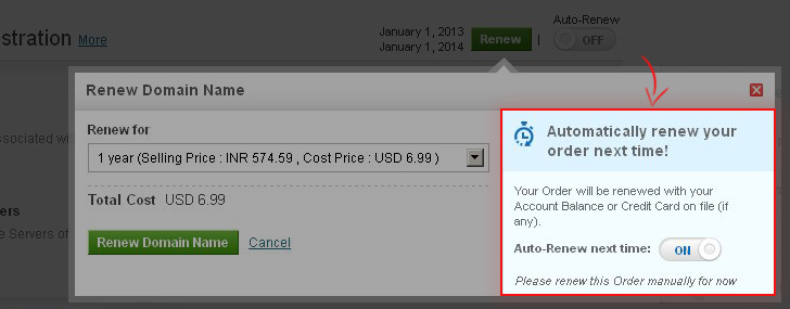 A customer/reseller can also turn Auto-Renewal ON for a particular order while manually renewing it. If the customer/reseller turns Auto-Renewal ON, then the system will attempt to Auto-Renewal that order next renewal cycle onwards. Hence, the customer/reseller must complete the current process of manual renewal.