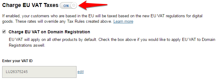 Uncheck the box next to Charge EU VAT on Domain Registration. to disable EU VAT for Domain Registration.