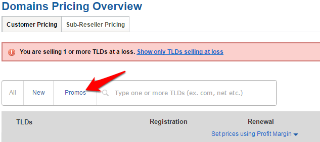 Click on the Promos link to list the TLDs with available promos.