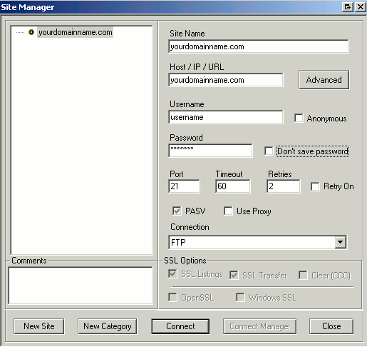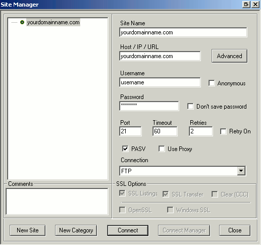 Provide your domain name under HOST / IP / URL. Type in your Username and Password and click Connect.