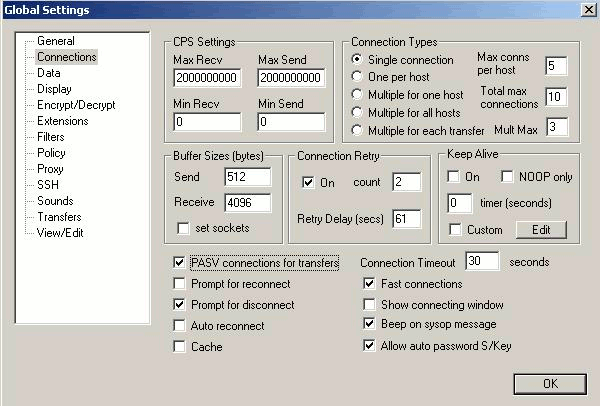 The Passive mode for data connection is set by default. Under the Global Settings dialog box, click Connections and uncheck PASV connections for transfers to enable the Active mode. Click OK to save the changes.